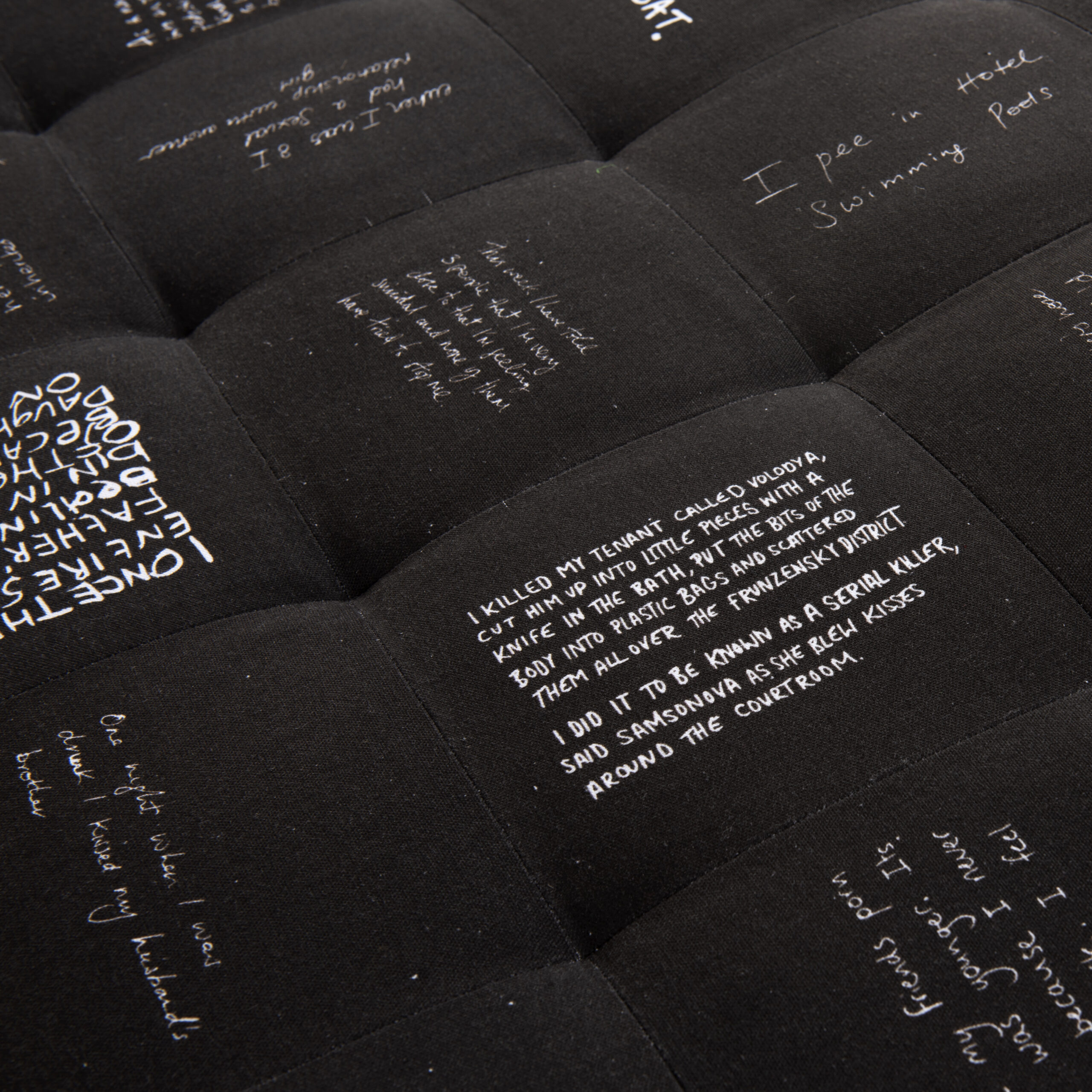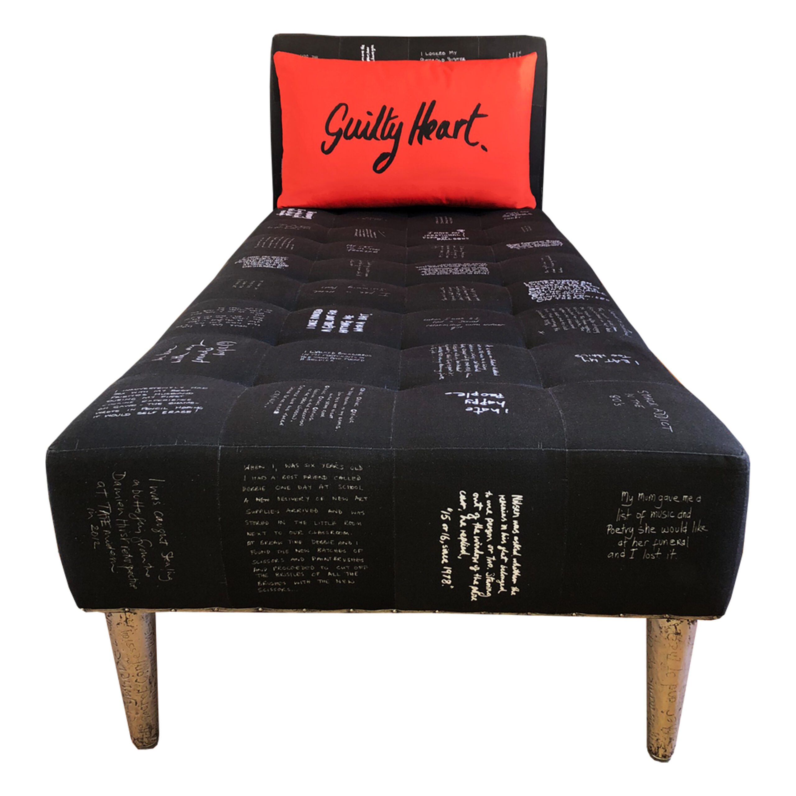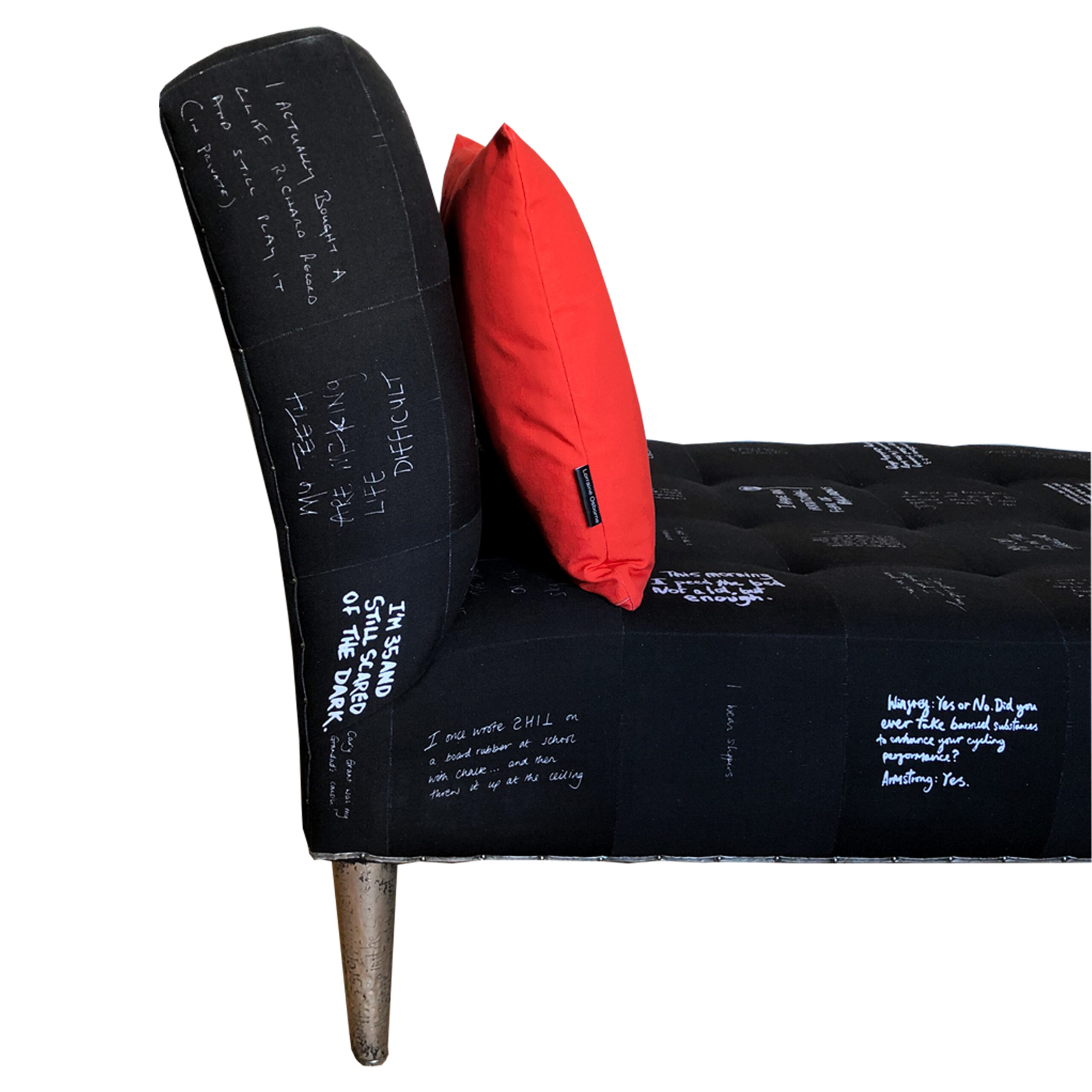 I designed and built The Confessional couch to accommodate them all in a patchwork design;adding a few notorious confessions to the mix (Yorkshire Ripper, Lance Armstrong) and finally of course, my own.