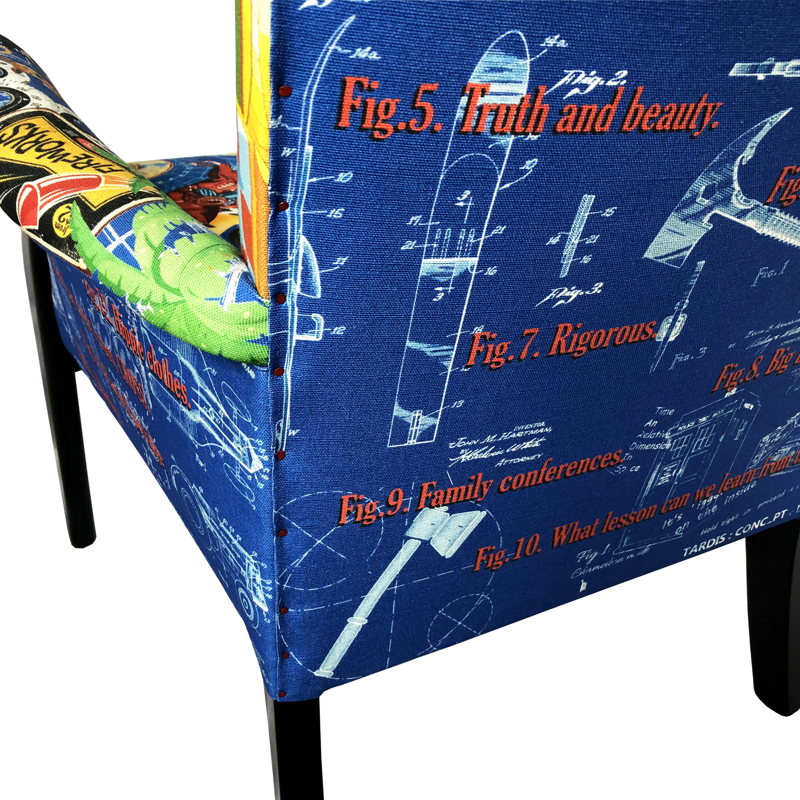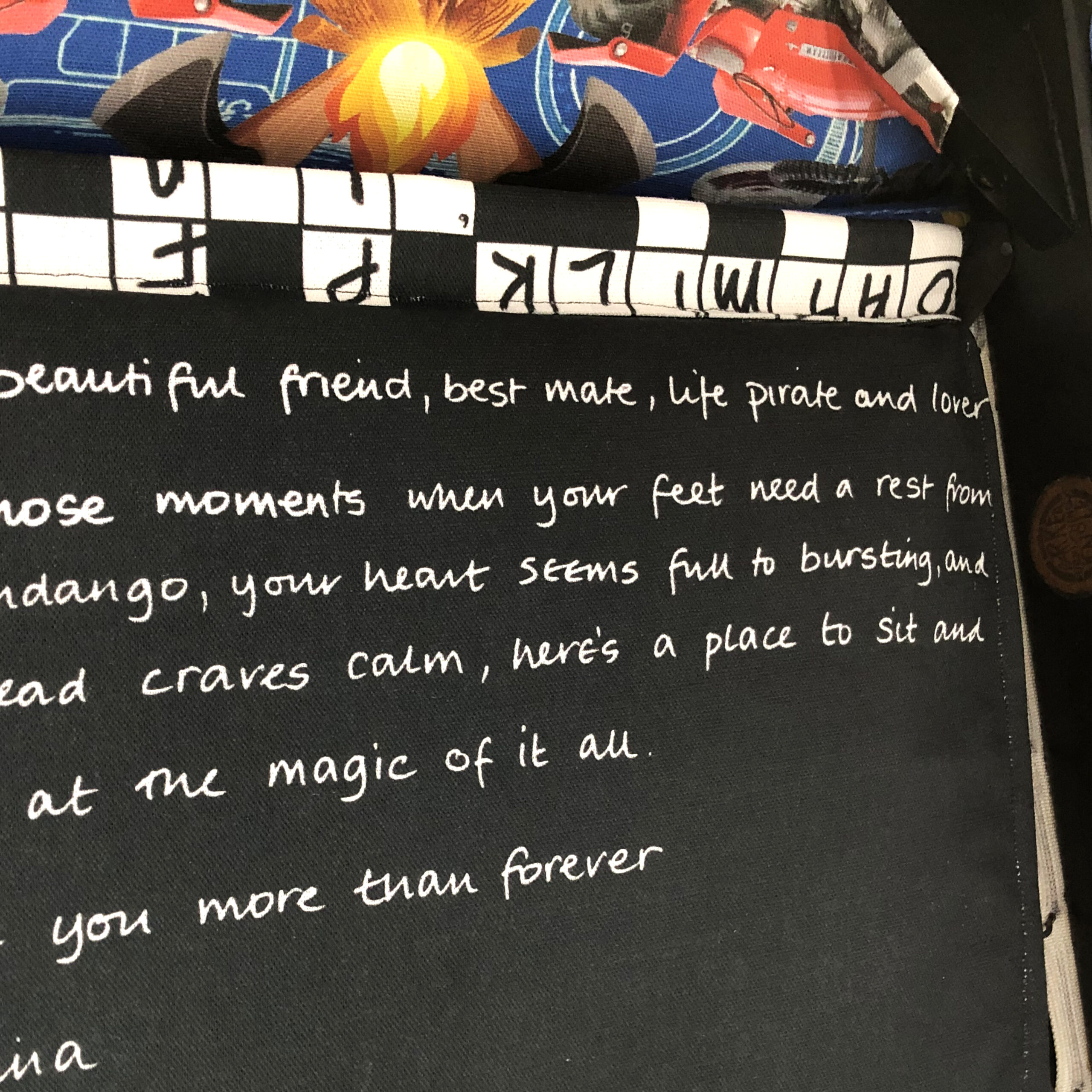 The recipients whole family contributed to the list of facts, imagery, quotations and general information about the birthday boy; I wove it into a fabric design and put it on a chair.