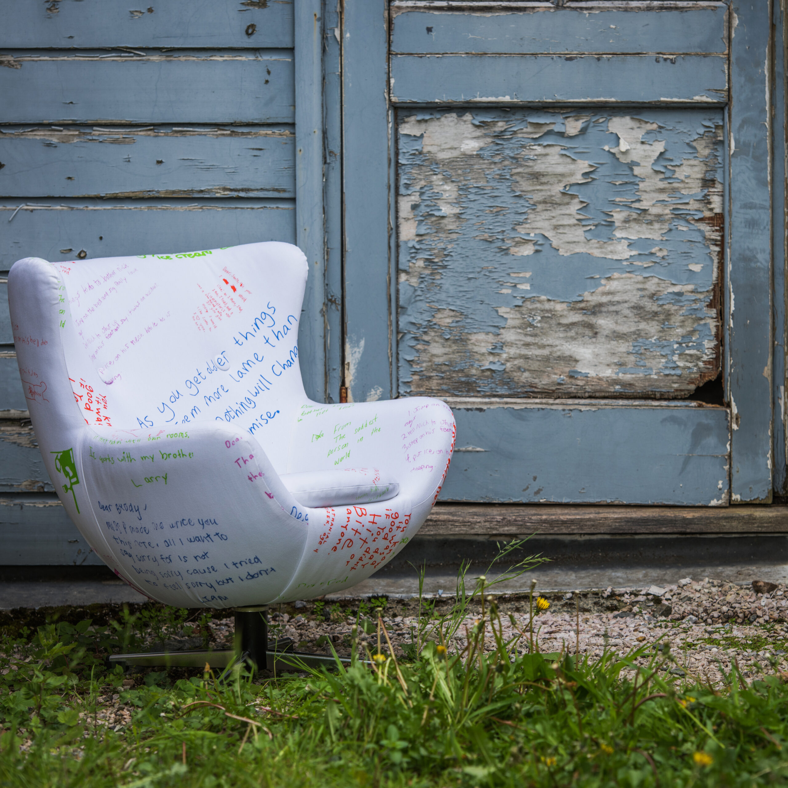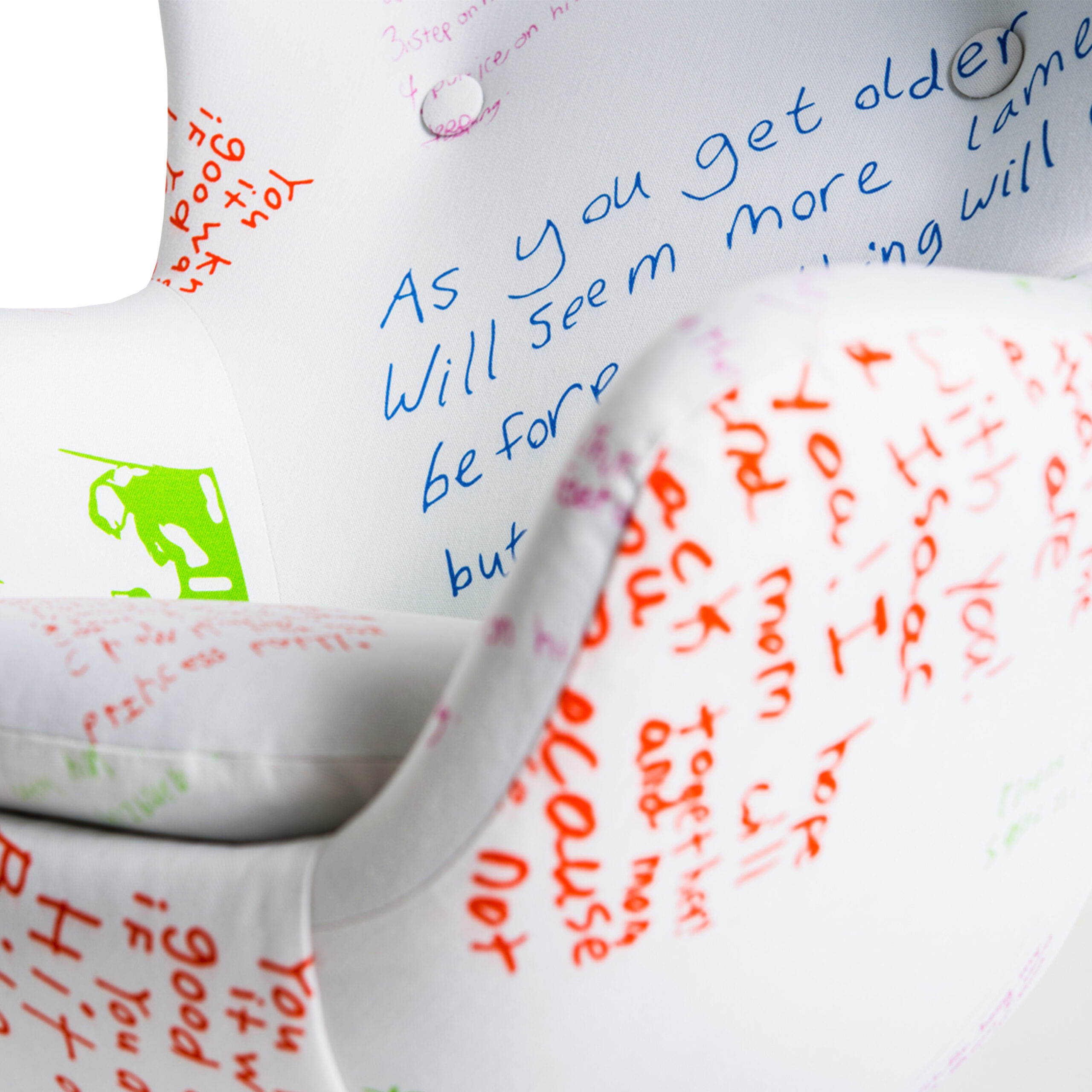 The chair was sold with a packet of coloured fabric pens so that the little darlings could add their own quotable gold to the design.