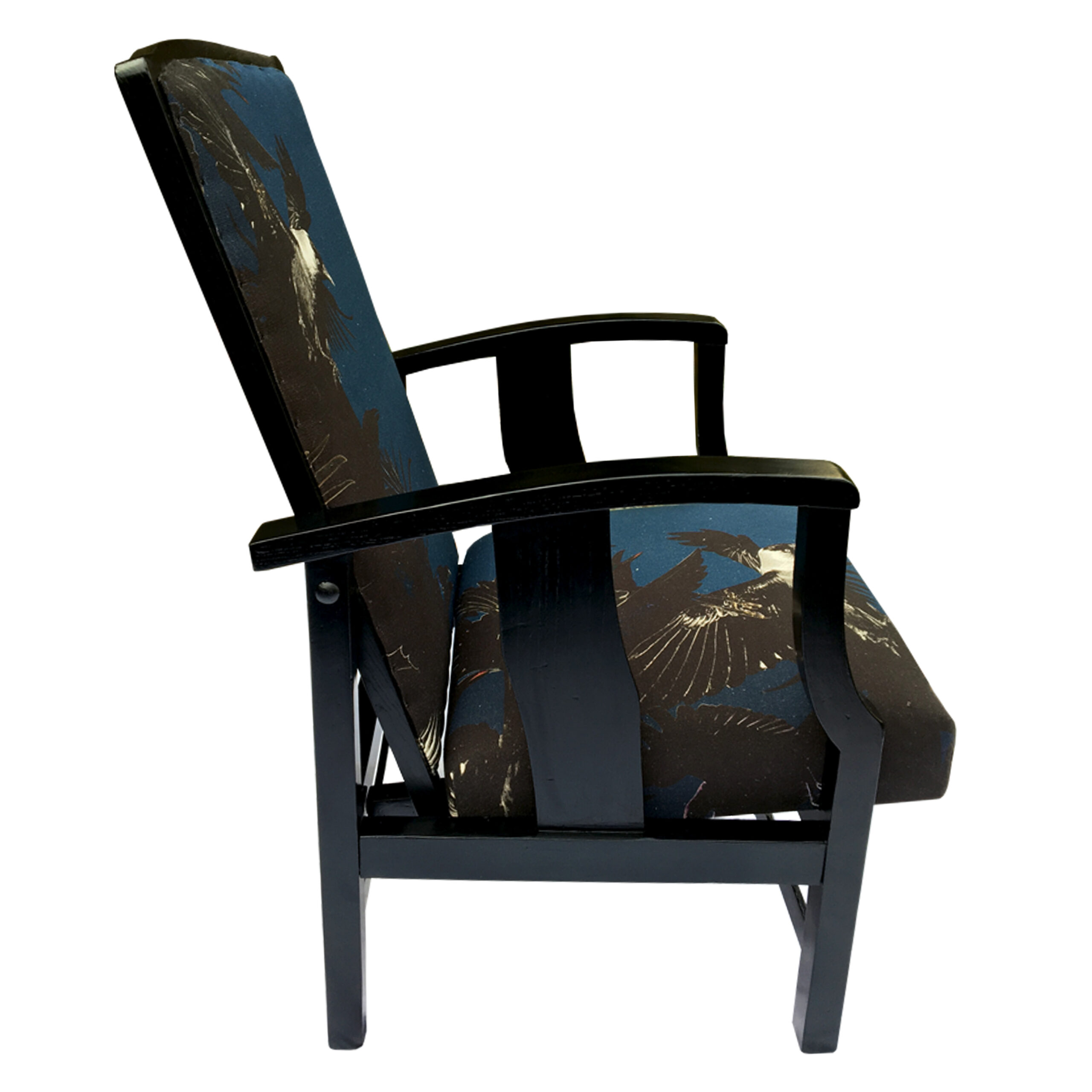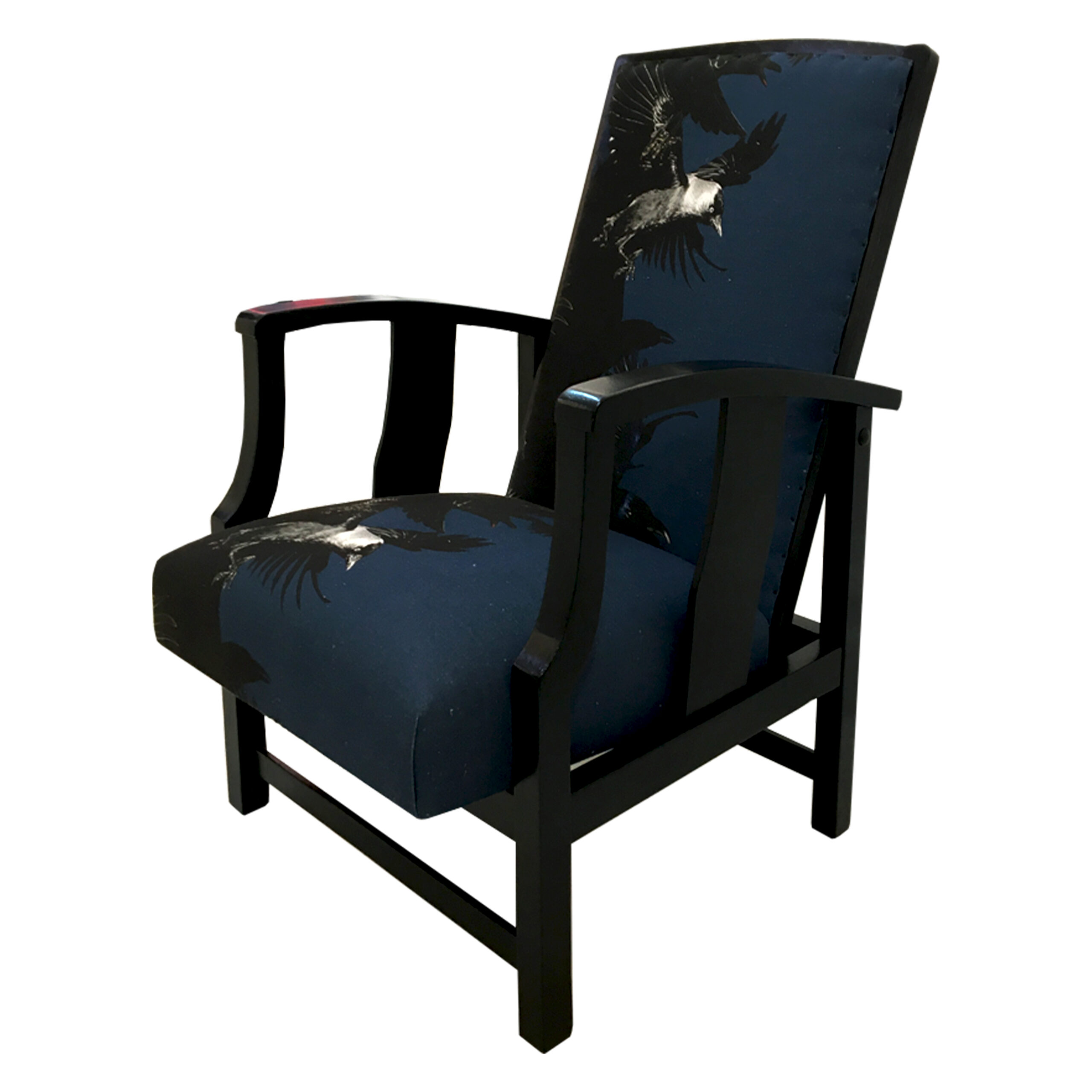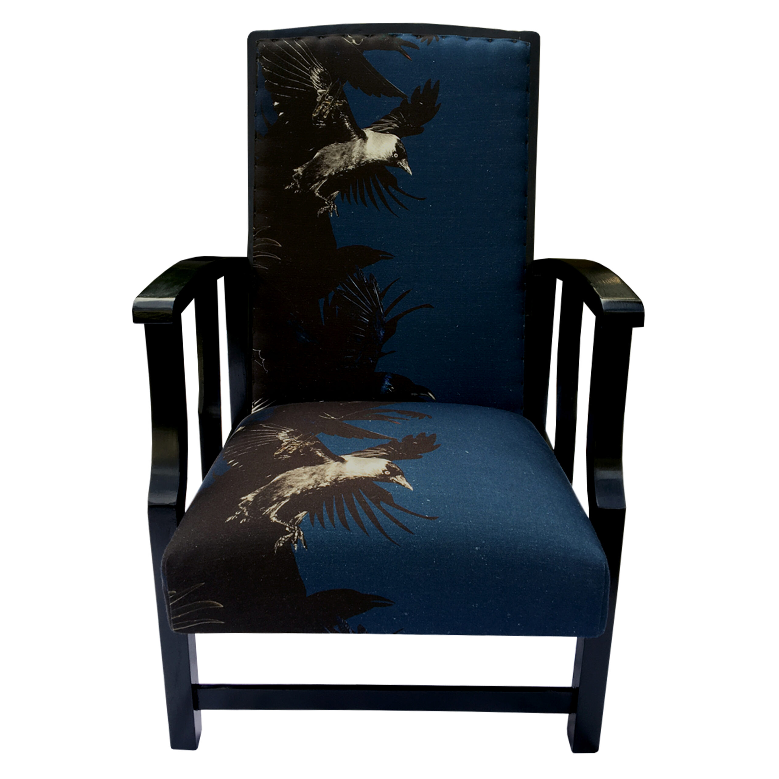 A re-reupholstered second hand chair. Fabric designed by Lorraine Osborne. Printed on linen at the Glasgow School of Art. Black painted and polished show wood.