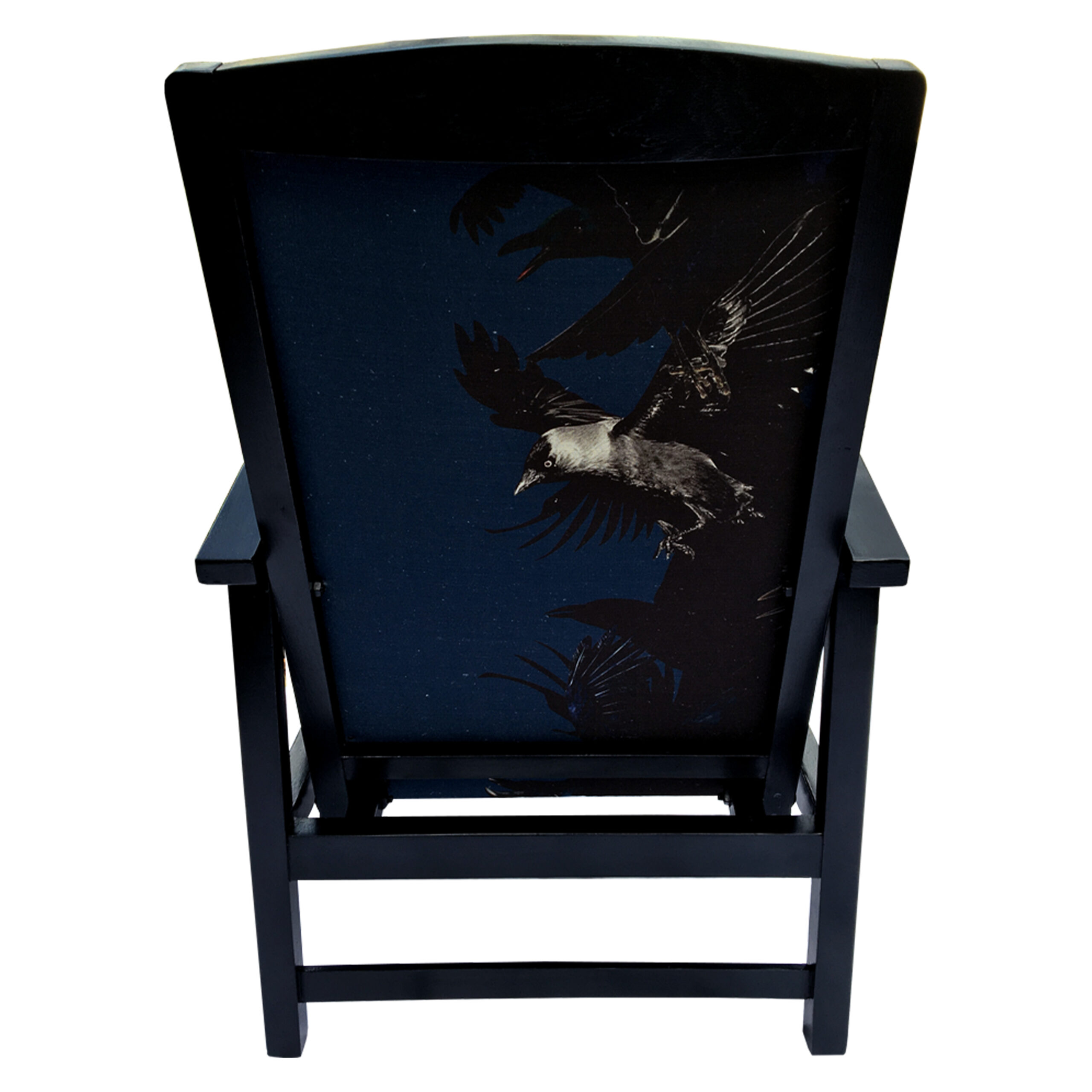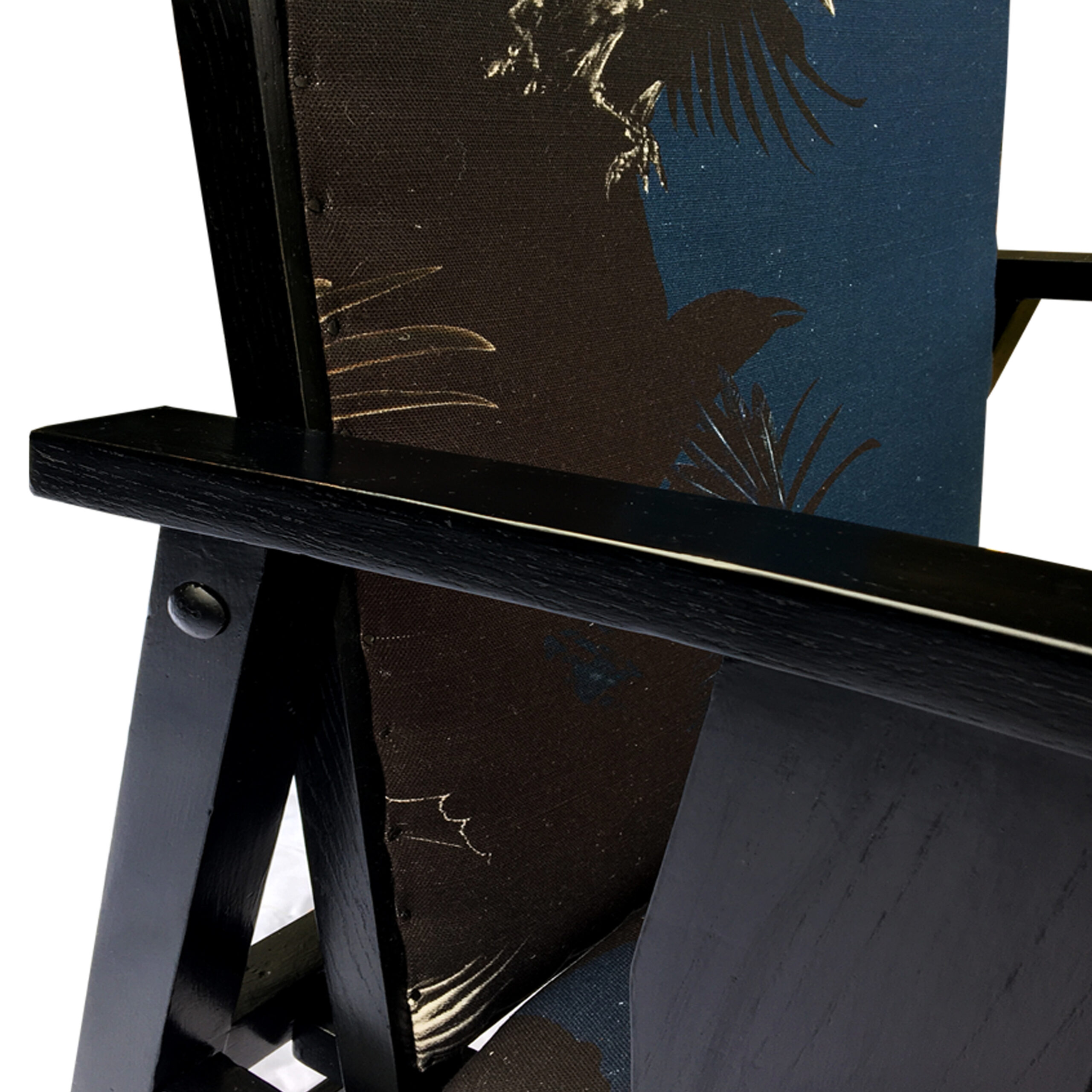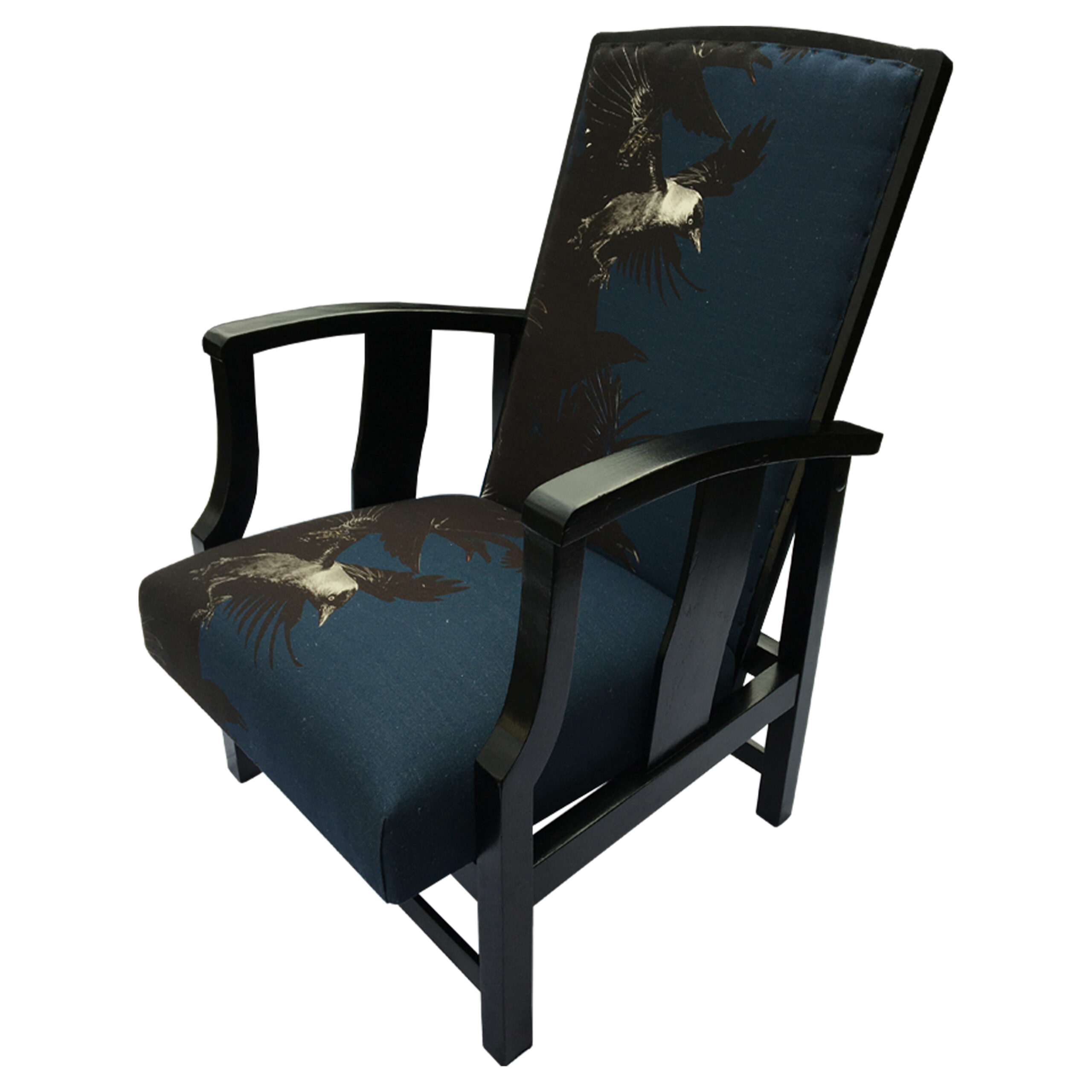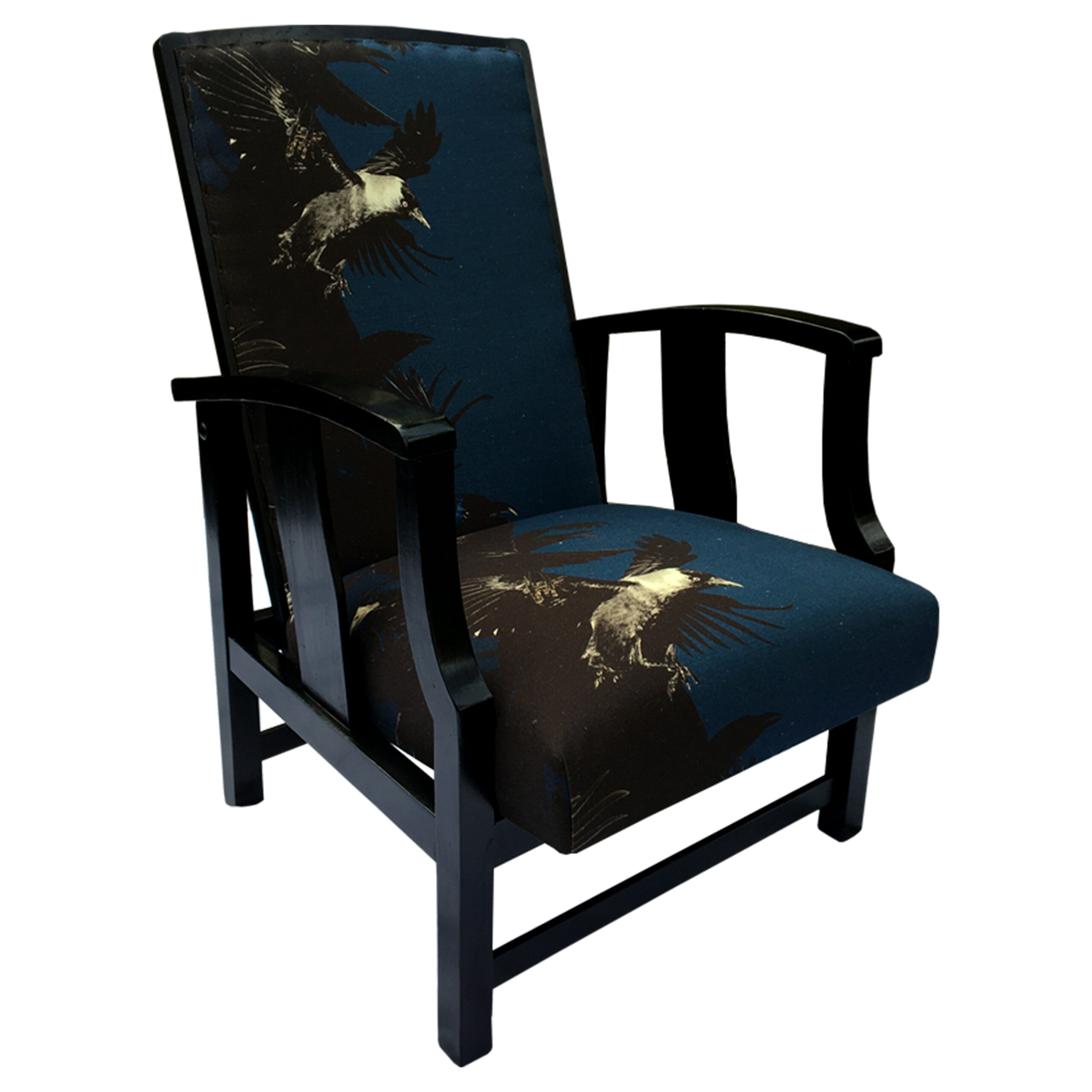 A re-reupholstered second hand chair. Fabric designed by Lorraine Osborne. Printed on linen at the Glasgow School of Art. Black painted and polished show wood.