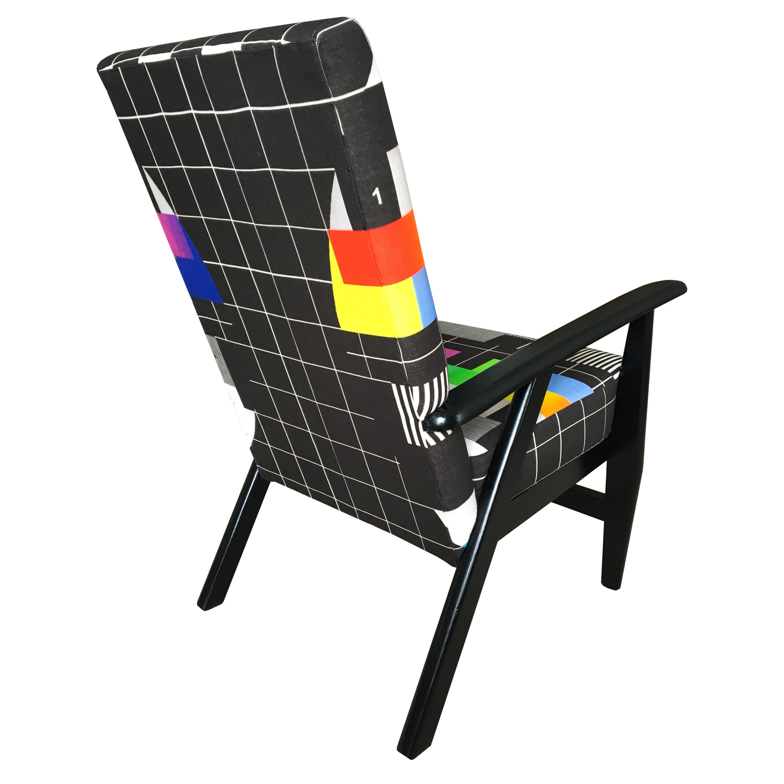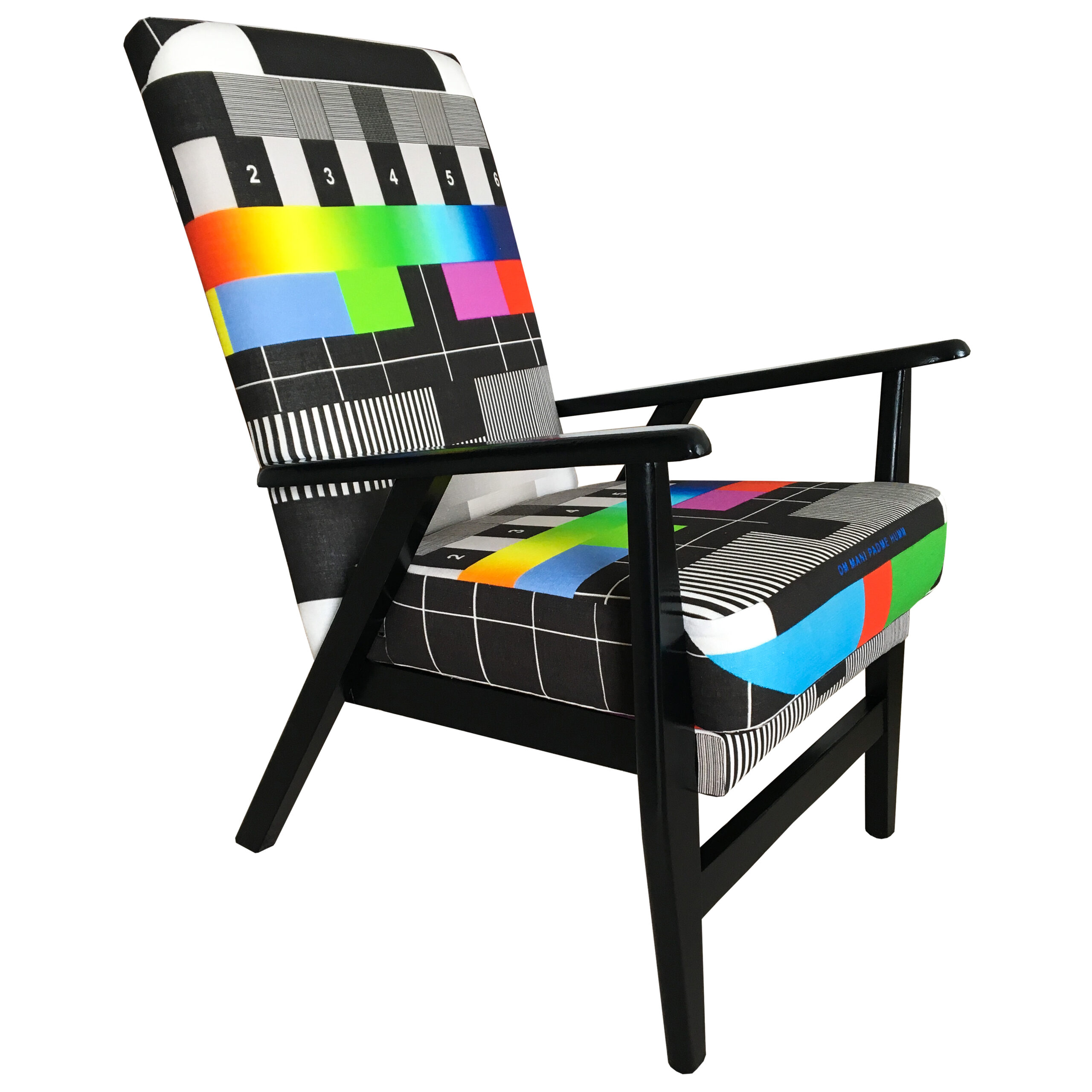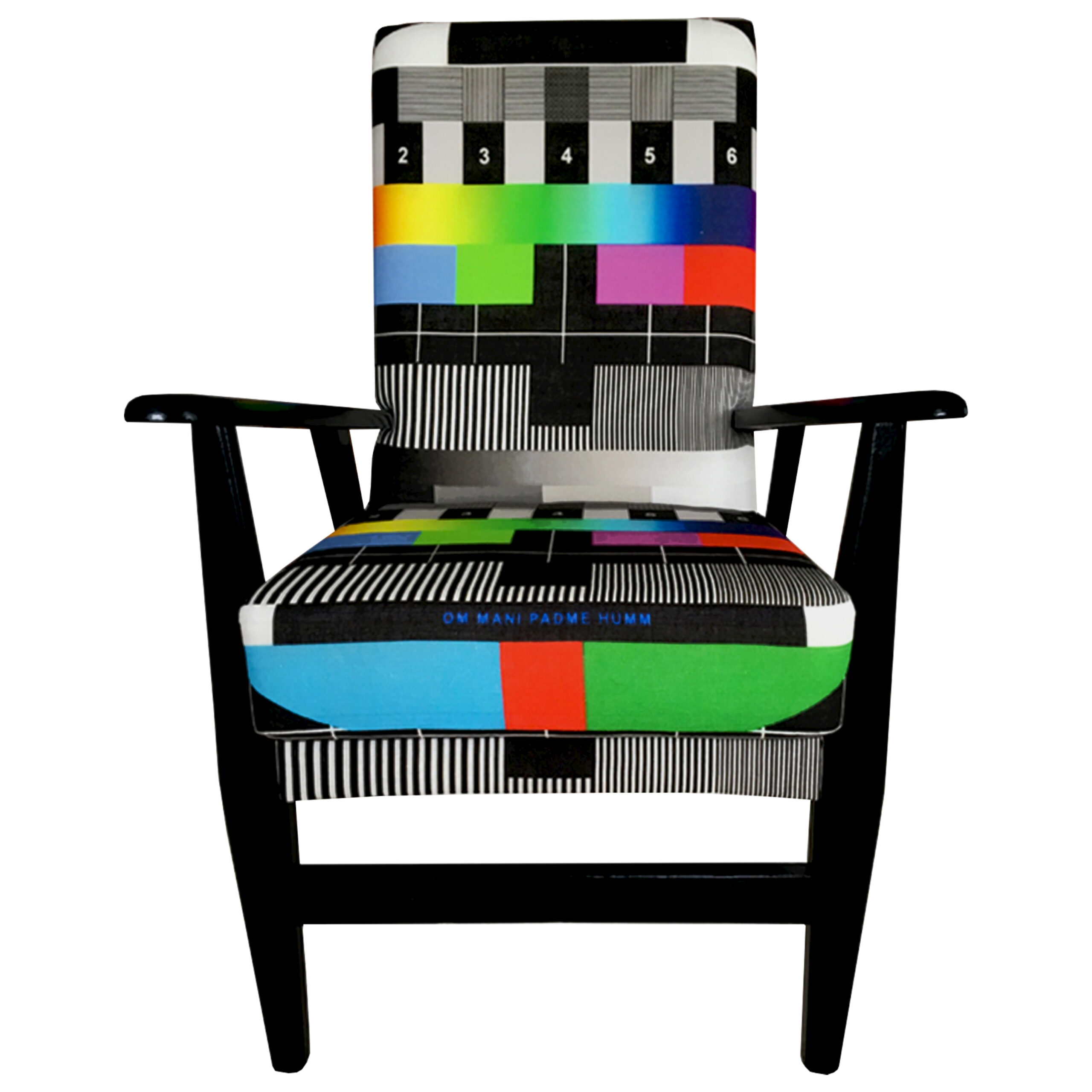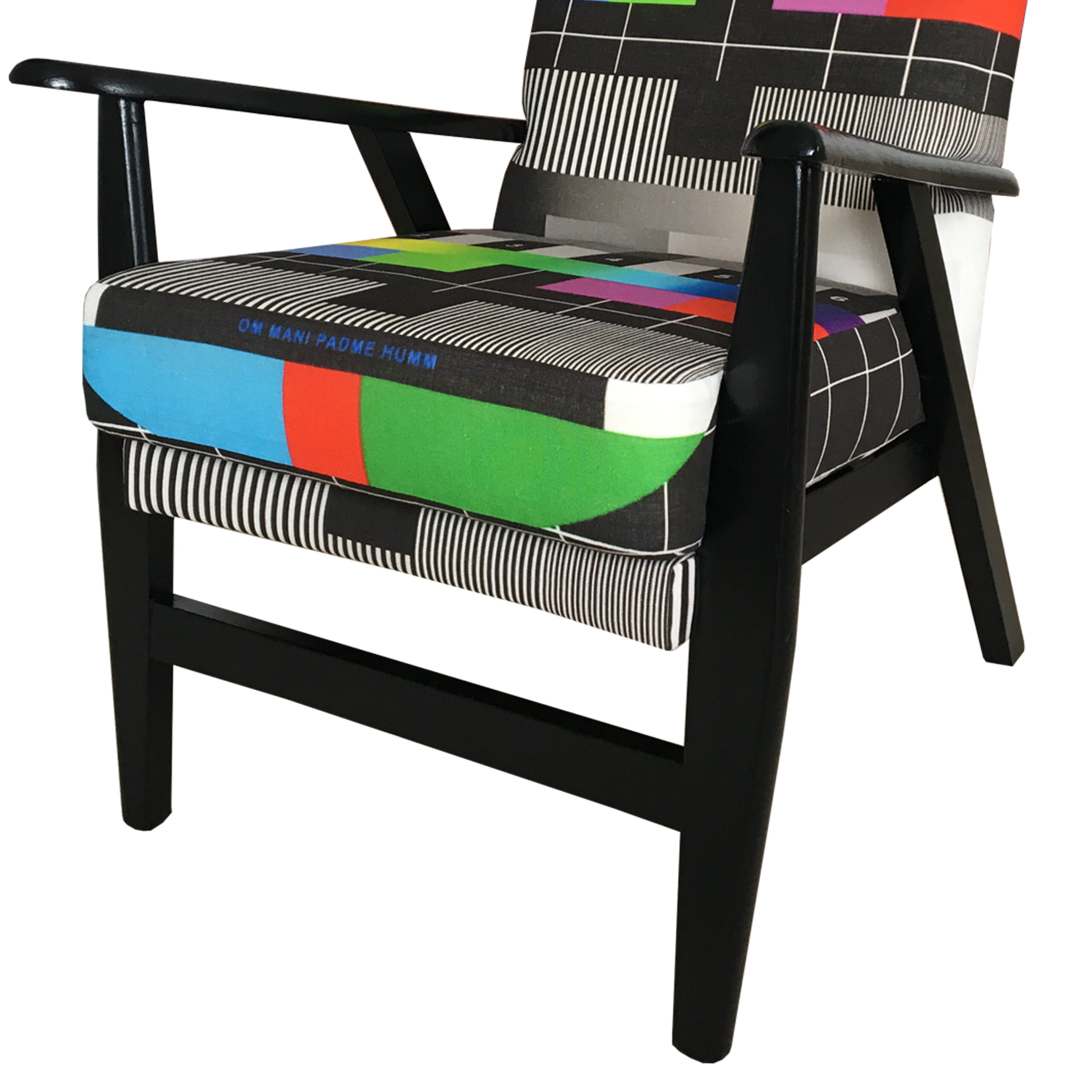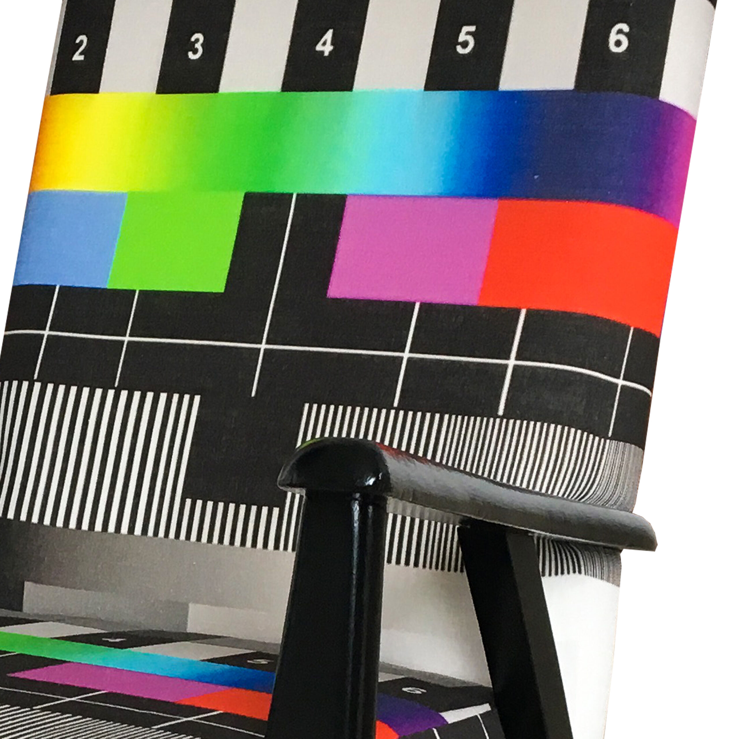The Test Card Chair is a tribute to my dad who was a TV repairman when I was a little girl. The image of the Test Card on broken TV’s in my dad’s workshop was part of the visual landscape of my childhood.